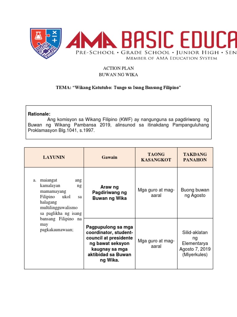 Pagkatapos ng Pang-umagang Panalangin Pagbubukas Cemented Area Natatanging Bilang Awit Guro at mag-aaral Lahat ng guro Administrador Agosto 15 Biyernes 1020 1210 Balagtasan Bulwagang Ehrentrudis Baitang 8 Regular na pagkaklase sa mga nasa Baitang 7 9 10 at Ikaapat na taon Mga Guro sa Asignatura 1255 245 nh. Aksyon plan sa filipino 2016 2017. Pakikiisa ito ng KWF sa proklamasyon ng UNESCO ng 2019 International Year of Indigenous Languages IYIL.