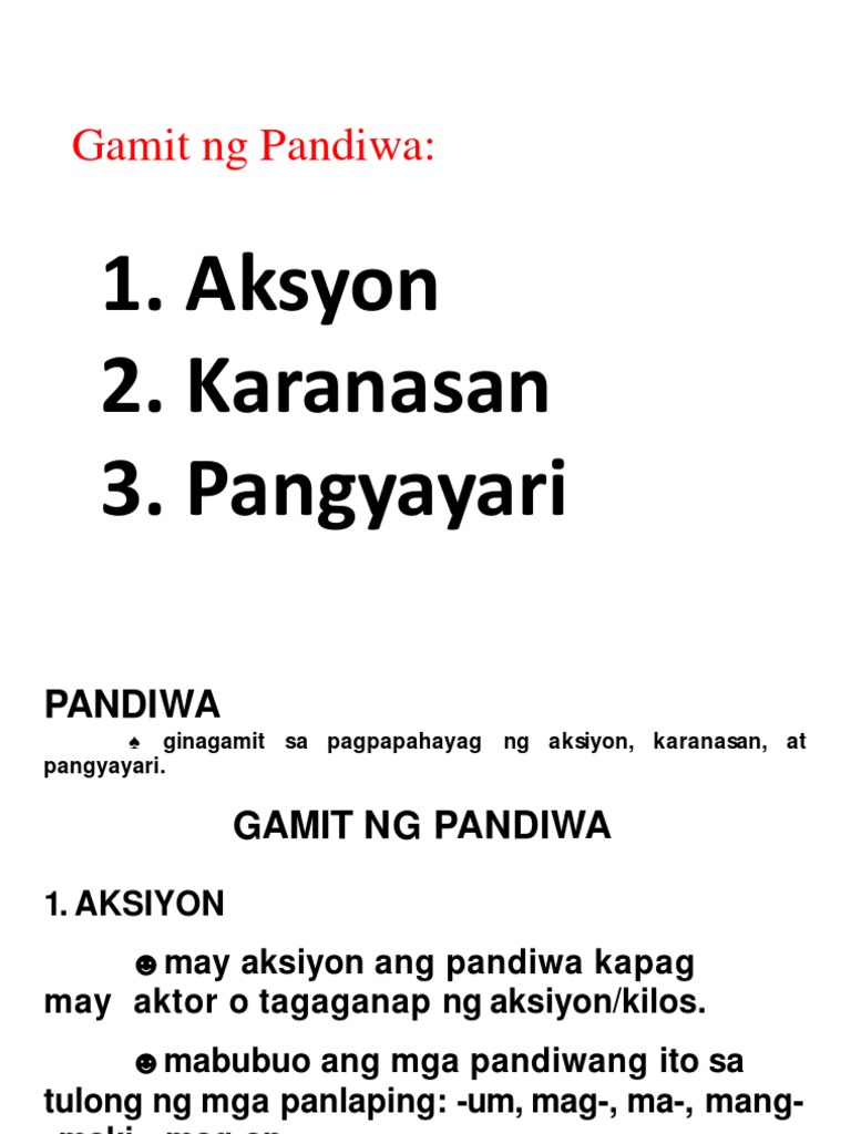 Dahil sa paggamit ng mga makadiwang panlapi nagkakaroon rin ng bagong diwa ang mga payak na salitang pandiwa. Gamit ng Pandiwa bilang Aksyon. Gamit ng pandiwa bilang aksyon pangyayari 1.